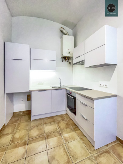 - 1 Küche mit reichlich Platz für einen Ess-Pausenbereich samt Fenster. Einbauküche inkl. aller Geräte (Geschirrspüler, Backofen, Herd, Dunstabzug mit Filter, Waschbecken, Kühl-Gefrierkombi) sowie einem Waschmaschinenanschluss
