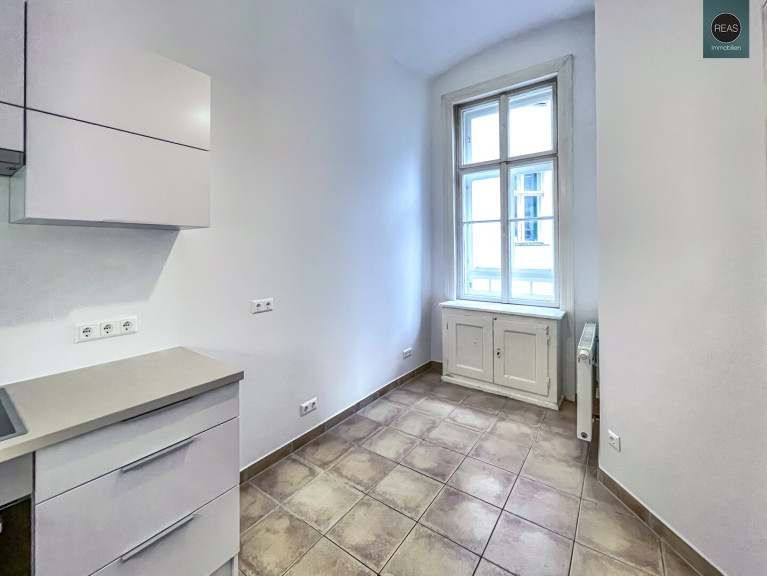 Zur hochwertigen Ausstattung gehören: Echtholz-Parkettböden, Einbauküche inkl. aller Geräte, 2 kleine Balkone, Flügeltüren, uvm.