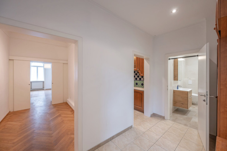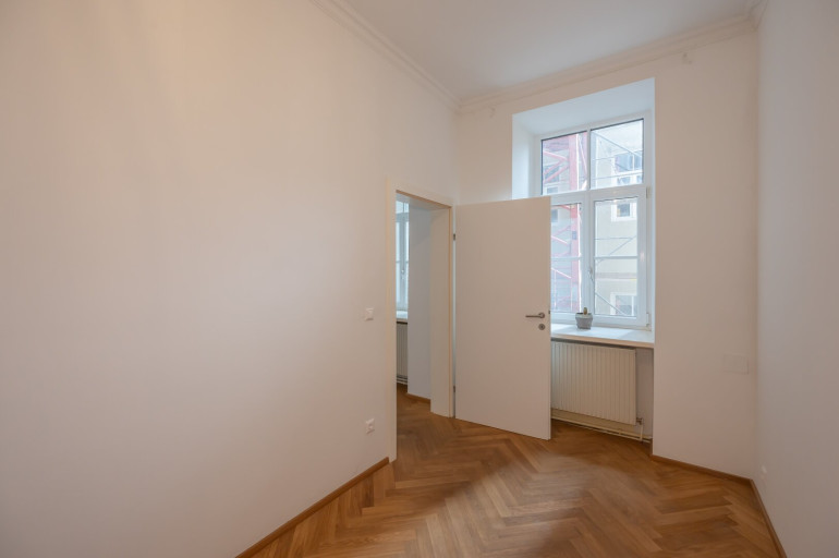 Die Wohnung selbst liegt im 1. Obergeschoß und erstreckt sich von der Straßen- zur Hofseite – eine Querbelüftung ist somit problemlos möglich. Sie wurde 2021 umfassend saniert, mit besonderem Fokus auf den Erhalt des klassischen Wiener Altbaucharakters. Auf rund 105 m² Wohnfläche mit einer Raumhöhe von ca. 3,15 m bietet die Wohnung drei großzügige Wohn- bzw. Schlafzimmer mit jeweils rund 19 m² sowie ein viertes Zimmer mit etwa 9 m². Ergänzt wird das Raumangebot durch zwei praktische Durchgangs-/Verbindungsräume (ca. 8 m² und 11 m²) – ideal als Garderobe, Stauraum oder Homeoffice. Die separate Küche, der großzügige Vorraum sowie das 2023 modernisierte Badezimmer mit bodentiefer Dusche und WC komplettieren den durchdachten Grundriss. Ein Kellerabteil mit rund 3 m² ist selbstverständlich vorhanden.