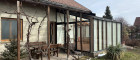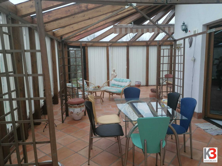 Man betritt das Haus durch einen Vorraum, der als Garderobe und Windfang dient, dieser führt in den Wohn-Essraum, der mit einem offenen Kamin und den hellen Räume sehr einladend wirkt, dort ist auch der Ausgang in den 50 m2 großen Wintergarten und auf die mit Glas überdachte Terrasse. Im Garten befindet sich ein Wellness Haus mit 15 m2 ausgestattet mit Sauna, Dusche und Whirlpool-Badewanne. Im Erdgeschoss befindet sich noch ein Schlafzimmer, ein Bad mit Dusche und WC sowie eine Küche mit Einrichtung und Essbereich.