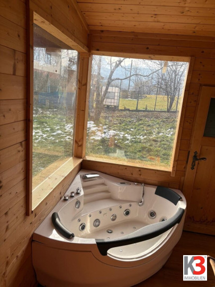 Parkett, Fliesen, Öl, Zentralheizung, Kamin, Einbauküche, Bad mit Fenster, Badewanne, Dusche, Carport, Garage, Sauna