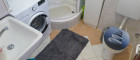 Das Badezimmer ist mit einer Dusche, einem Waschmaschinenanschluss und einem Fenster ausgestattet, das für angenehmes Tageslicht sorgt. Ein großzügiger Abstellraum, der vom Flur aus begehbar ist, bietet viel Platz für Vorräte und zusätzliche Staumöglichkeiten.