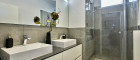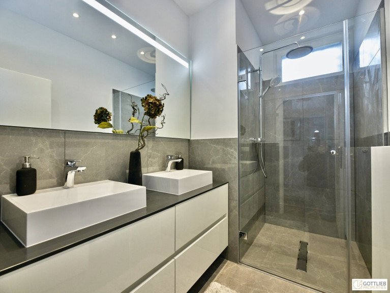 + Tageslicht-Duschbad mit bodenebener Glaswand-Dusche, Doppelwaschtisch mit Unterschrank und Spiegel sowie Handtuchwärmer
