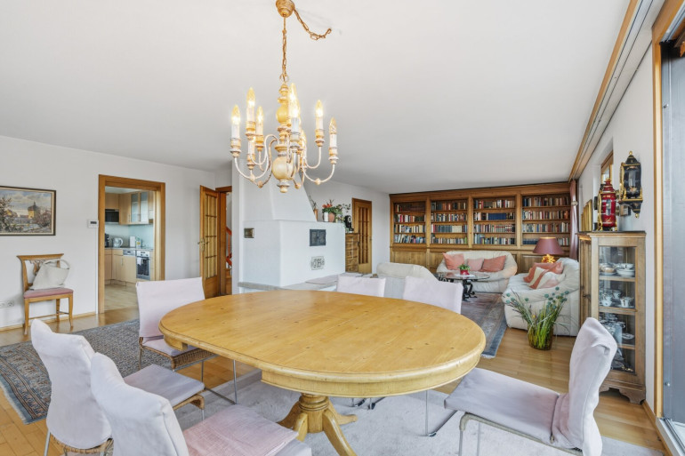 Hochwertige Parkett- und Fliesenböden schaffen eine warme Wohnatmosphäre, während die Einbauküche zum Mittelpunkt des täglichen Lebens wird - ein Ort zum Kochen, Genießen und Zusammensein.