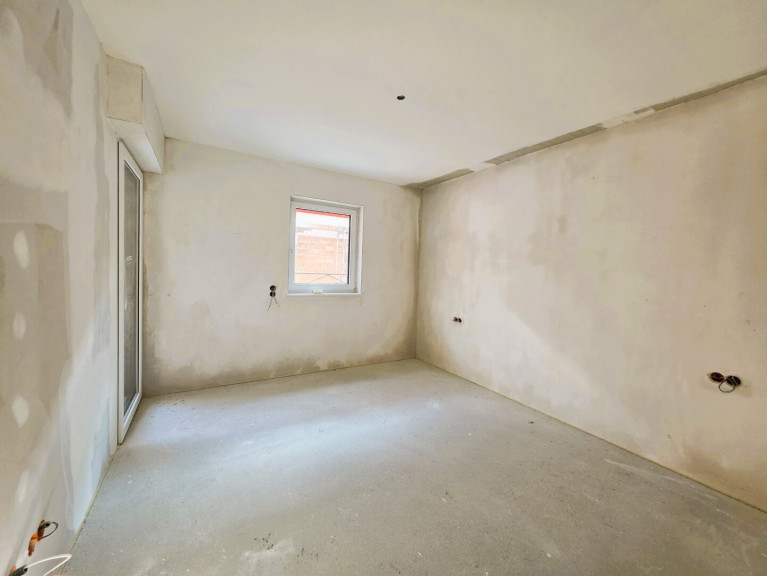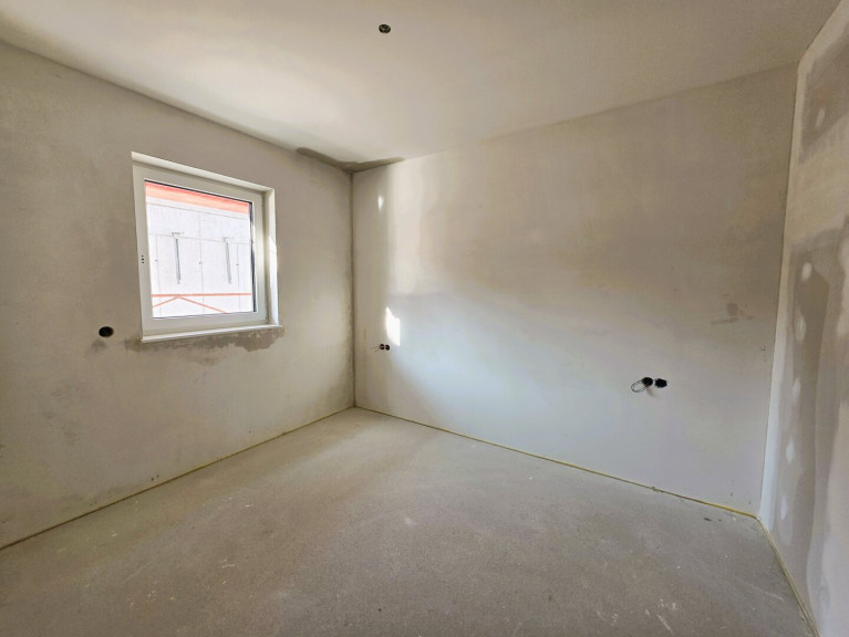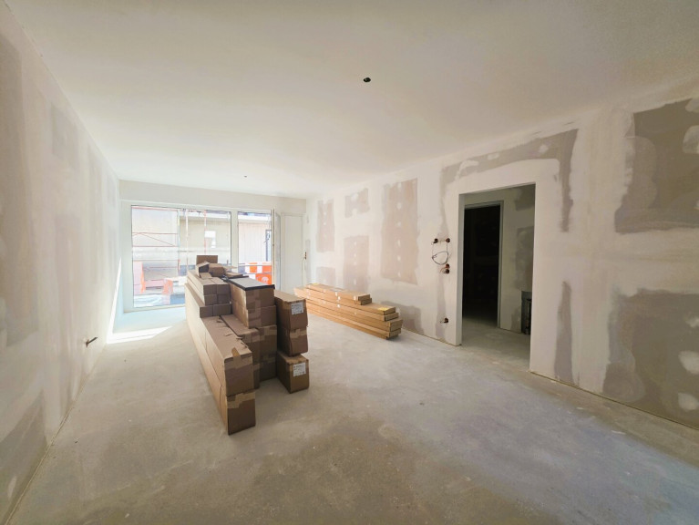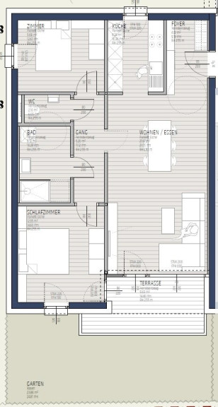Im Wohnbereich wird ein Klebeparkett in Eiche verlegt. Zur Terrasse hin befindet sich ein bodentiefes, fix verglastes Fenster und eine Balkondrehtüre.