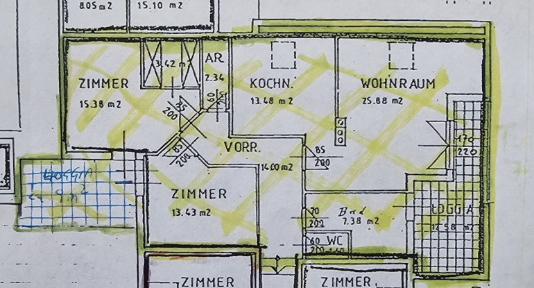 Sie verfügt über 3 Zimmer, 1 Küche, 1 Badezimmer inkl. Badewanne, 1 WC, 1 Abstellraum, 1 Loggia Süd-West und 1 Nord-Ost, 1 Kellerabteil und 1 Stellplatz. Ein zweiter Autoabstellplatz optional.