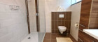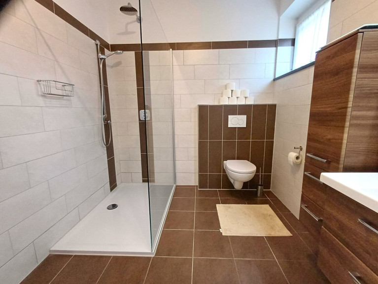- Badezimmer mit WC, bodentiefer Dusche, Waschtisch und Fenster