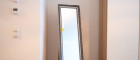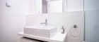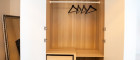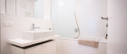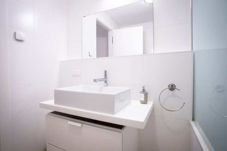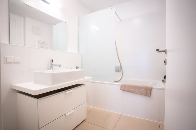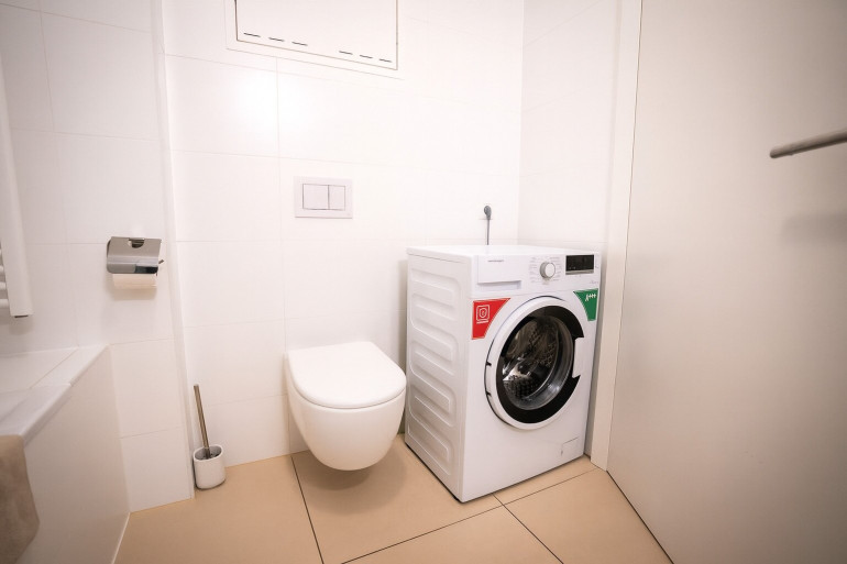 The bathroom is clean and modern. It has a bathtub with a glass shower screen, a large sink with storage space and a washing machine. The entrance area includes a full length mirror, a coat rack and additional storage.