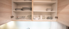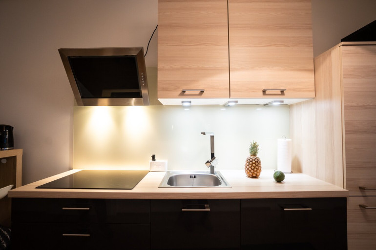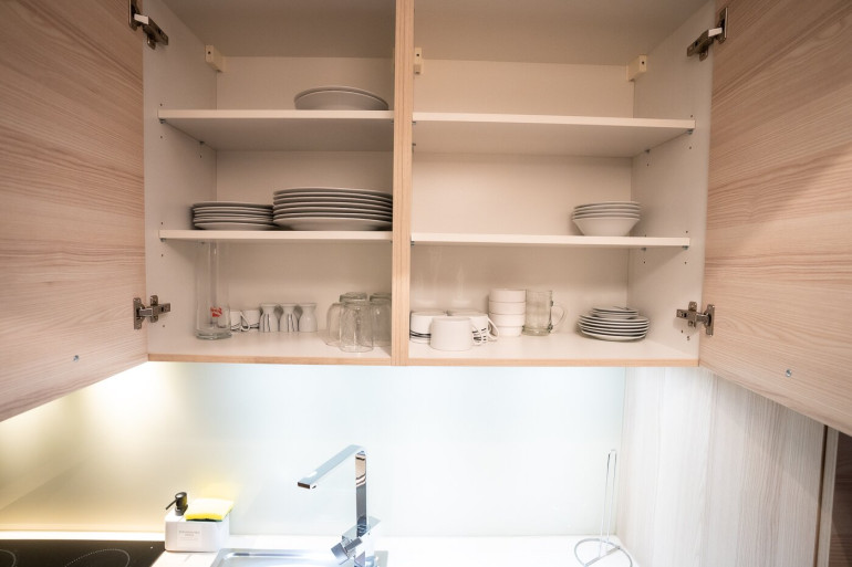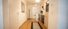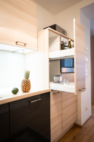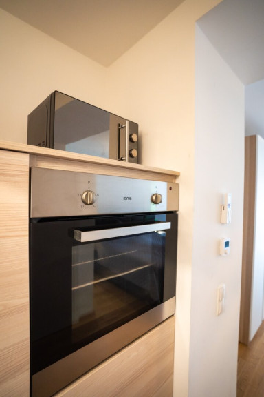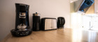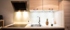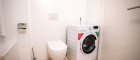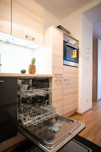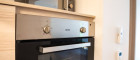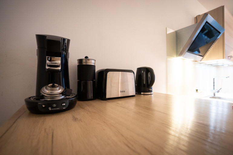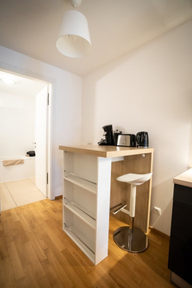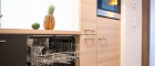 The kitchen is fully equipped with a cooktop, oven, microwave, dishwasher, toaster, kettle and coffee machine. All dishes and kitchen utensils are already provided. A small dining counter offers a practical place for meals or work.