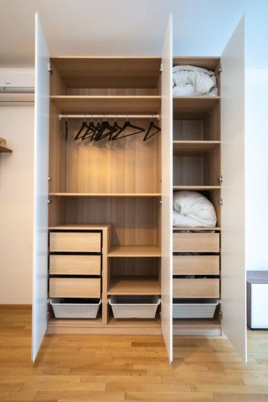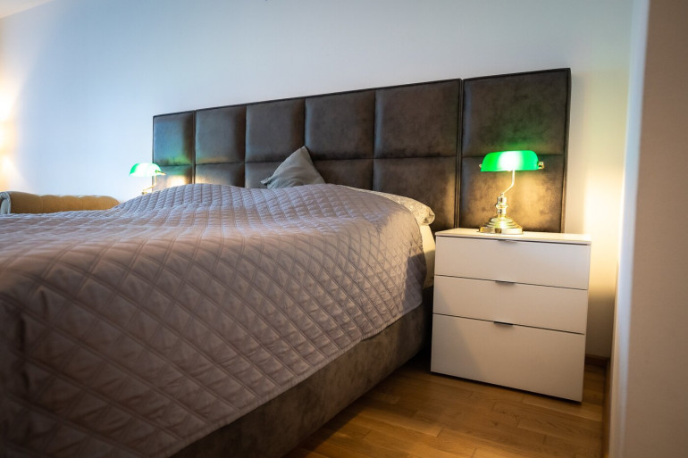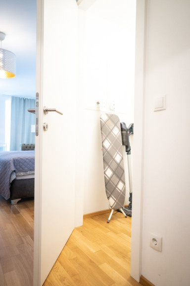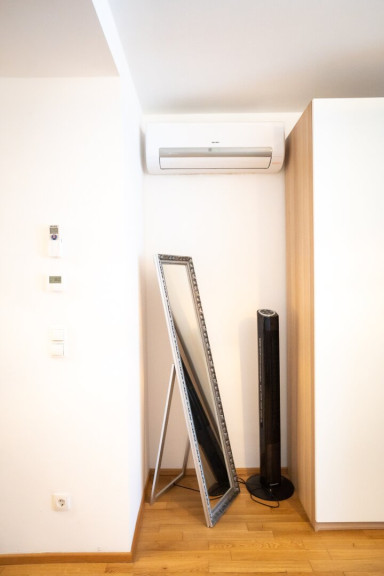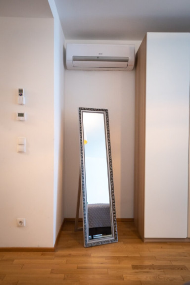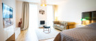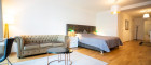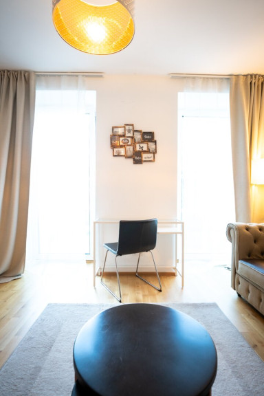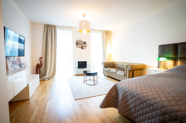 This modern studio apartment is spacious, bright and very comfortable. The main room includes a high quality bed, a cosy sofa, a TV area and a small workspace. The large windows bring in plenty of natural light and create a warm and pleasant atmosphere.