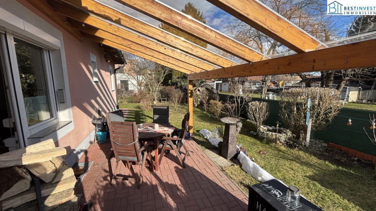 Die Terrasse eröffnen Ihnen einen herrlichen Blick auf den liebevoll angelegten Garten – der ideale Rückzugsort, um die Seele baumeln zu lassen und die Natur zu genießen.