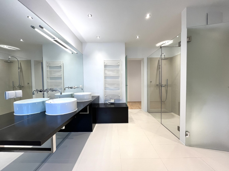 einem großen Wohnsalon mit möblierter, modernst ausgestatteter Küche, zwei Schlafzimmern mit zwei luxuriösen Badezimmern, einem Wirtschaftsraum, Vorraum sowie einem separaten WC.