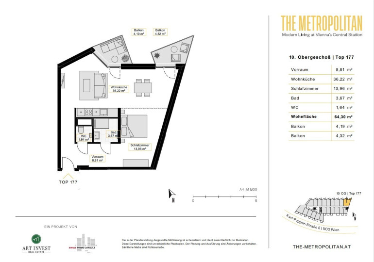 Hippe Cafés, coole Bars und jede Menge Unbeschwertheit: The Metropolitan liegt an der schillernden Vienna Central Station zwischen dem modernen Quartier Belvedere und dem grünen Sonnwendviertel. Hier können Sie abseits des Mainstreams der Stadt abhängen und originelle Shops, Lokale, Kunst- und Kulturangebote sowie Frischluft in grünen Parkanlagen vor der Haustüre genießen. Zahlreiche attraktive Plätze laden zum Verweilen, Bewegen und Staunen ein. In nur wenigen Schritten sind die Bezirke Wieden, Landstraße und das historische City Center erreichbar. Ob Tennis im Arsenal, zeitgenössische Kunst im Belvedere 21 oder ein Cocktail auf der Rooftop-Bar gegenüber – in der Karl-Popper-Straße 5 kann man eins werden mit dem pulsierenden Stadtleben und zwischendurch Ruhe in den benachbarten und üppig grünen Parks finden. Alles ist möglich – an diesem einmaligen Standort.