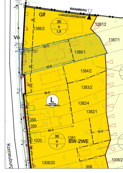 Das Grundstück im Ausmaß von 1407 m² ist im Flächenwidmungsplan als Bauland-Wohngebiet ausgewiesen (max. 2 Wohneinheiten, 30 % Verbaubarkeit, offene Bauweise, 7 m Gebäudehöhe). Der hintere Teil des Grundstückes ist als Grünland ausgewiesen. Es gibt keinen Bauzwang.