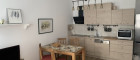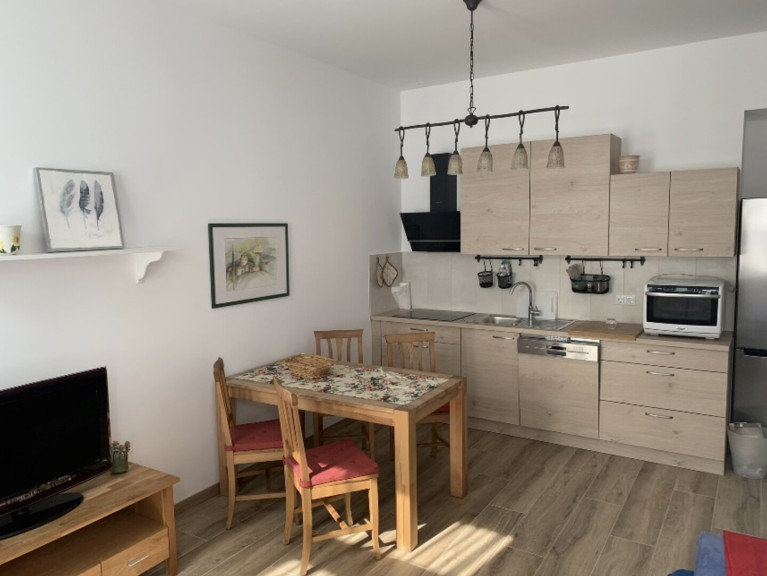 The living area features an open plan kitchen equipped with an electric stove, dishwasher, large refrigerator with freezer and a combined microwave oven. A dining table with four chairs and a sofa that converts into a 160 by 200 centimetre bed complete the space. Independent gas central heating ensures comfortable temperatures throughout the apartment.