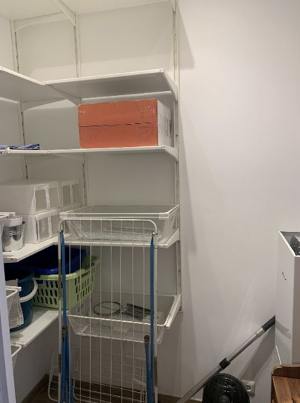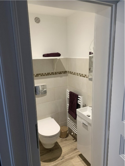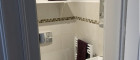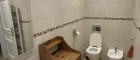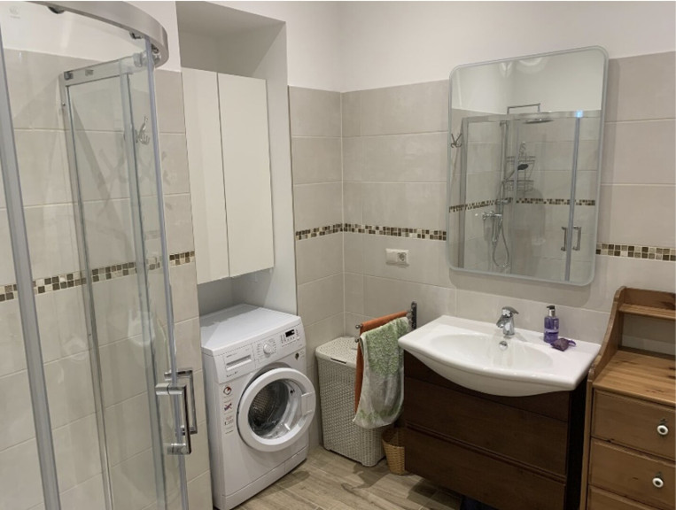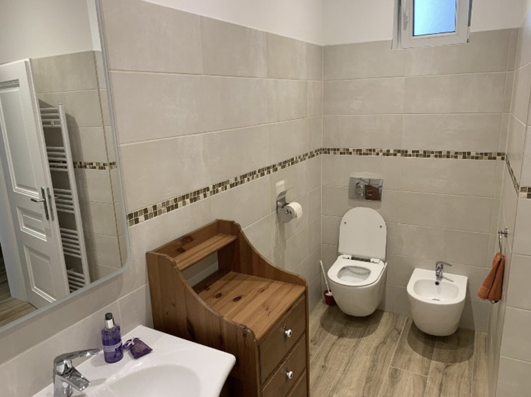 The large bathroom includes a shower, washbasin with mirror, bidet, toilet and a washing machine. An additional separate toilet is also available. A storage room with multiple storage fixtures provides further practical space.