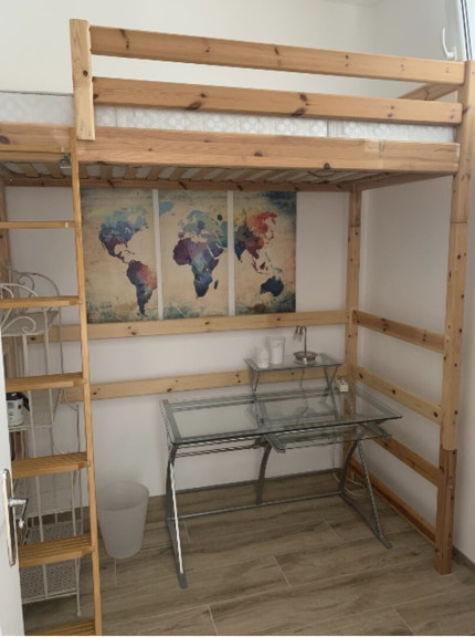 The main bedroom is furnished with a 160 by 200 centimetre bed and a spacious three door wardrobe arranged on two levels. The second bedroom features a high bed with a height of 190 centimetres, a desk and a two door wardrobe with drawers, making it ideal as a guest room or home office.