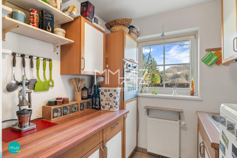 Die angrenzende Küche, die bei Bedarf auch geöffnet und in eine große Wohnküche umgebaut werden könnte, sowie ein Vorzimmer mit Garderobenbereich und eine separate Toilette mit Handwaschbecken ergänzen diese Ebene zu einem harmonischen Wohnbereich.
