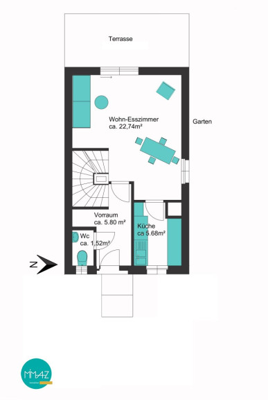 Das Herzstück bildet das Wohnzimmer im Erdgeschoss mit direktem Ausgang auf die Terrasse und in den ca. 315 m² großen Eigengarten - ein Ort für Frühstück in der Sonne, spielende Kinder und entspannte Grillabende.