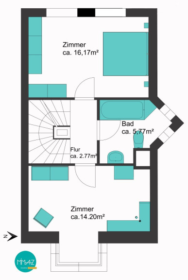 Das zweite Obergeschoss eröffnet mit einem großzügigen, offen gestalteten Raum vielfältige Nutzungsmöglichkeiten – ob als Homeoffice, Atelier, Spielzimmer oder zusätzlicher Wohnbereich. Ein weiteres Schlafzimmer sowie der Zugang zum Spitzdachboden bieten zusätzlichen Raum und Stauraum für persönliche Bedürfnisse.