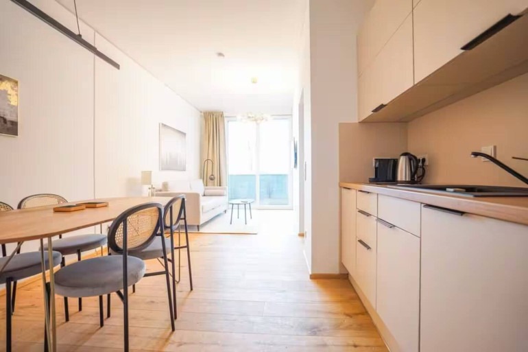 This modernly equipped apartment is located on the second floor of the TrIIIple Tower in Vienna’s third district and offers a contemporary living concept within one of the city’s most innovative residential developments. The TrIIIple Towers stand for urban premium living and impress with exceptional shared amenities. A particular highlight is the exclusive rooftop pool with panoramic views over Vienna, available exclusively to residents. In addition, a library for individual use as well as a separately rentable party kitchen for private celebrations or events are available.