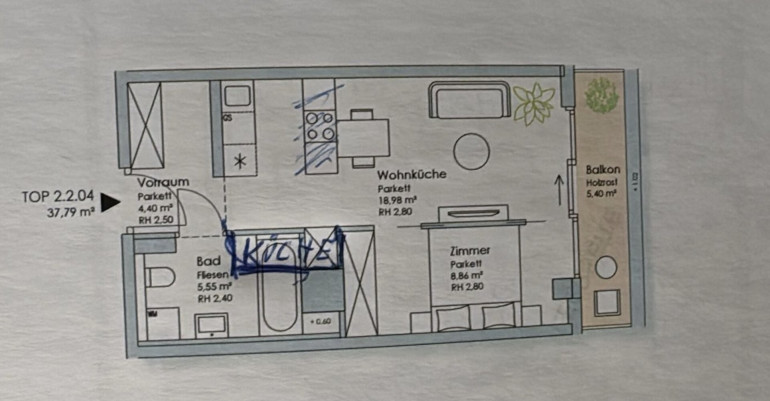 Auf einer Wohnfläche von rund 38 Quadratmetern stehen ein Wohnbereich, ein Schlafbereich, ein offener Koch Essbereich sowie ein Badezimmer mit WC zur Verfügung. Ergänzt wird das Raumangebot durch einen Balkon mit etwa 5,40 Quadratmetern, der zusätzlichen Freiraum bietet. Durch die klare Trennung von Wohn- und Schlafbereich sowie die zusätzliche Garderobennische bietet die Wohnung einen besonders angenehmen und funktionalen Grundriss.