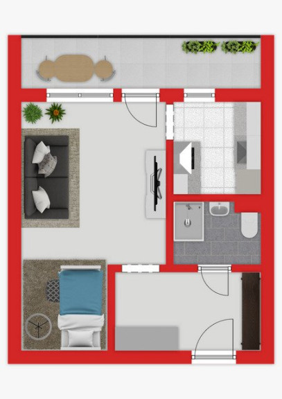 Der Wohnraum ist äußerst effizient geschnitten und bietet dank intelligenter Planung ein angenehmes Wohngefühl. Die einladende Loggia mit Südausrichtung lädt dazu ein, den Blick ins Grüne zu genießen – ob beim Frühstück am Morgen oder zum Entspannen nach einem langen Tag.