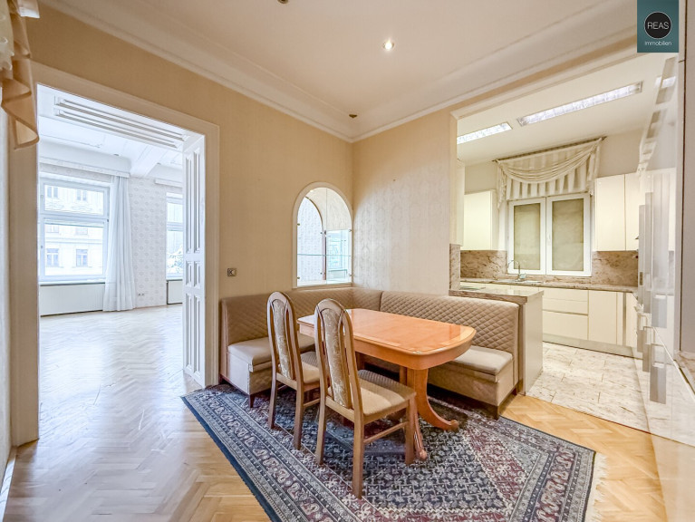 - 1 Essbereich neben der Küche mit einer Glasvitrine/einem Fenster zum Wohn-Esszimmer
