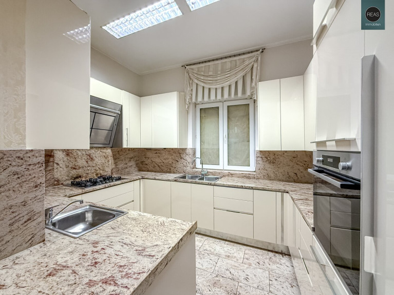 - 1 Küche mit einer hochwertigen und voll ausgestatteten Einbauküche mit allen Geräten (2 Spülbecken, Geschirrspüler, großer Gasherd, Dunstabzugshaube, Backofen, Kühlschrank)