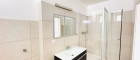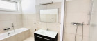 - einem Badezimmer (Dusche, Badewanne, Spiegel, Waschbecken mit Verbau, Waschmaschinenanschluss und Fenster)