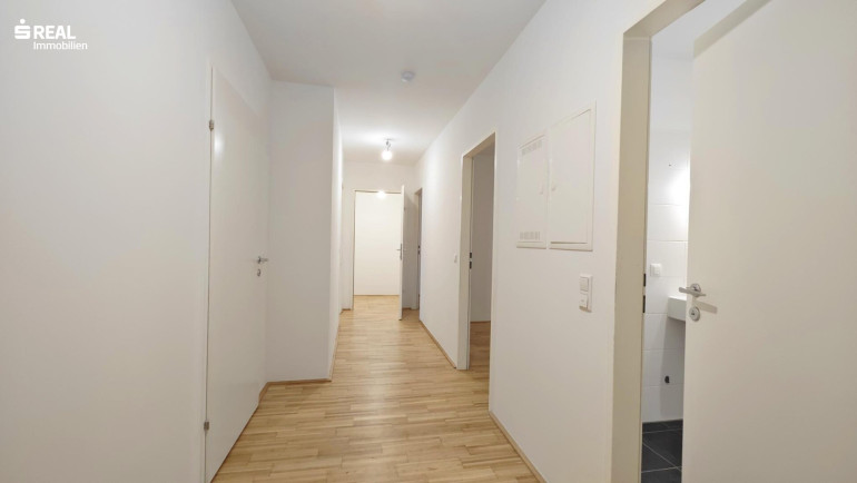 Sie besteht aus einer Wohnküche (ganz neue Einbauküche mit allen Geräten), zwei Schlafzimmern, einem Bad, einem WC und einem praktischen Abstellraum. Der Wohnung ist auch ein Kellerabteil zugeordnet.