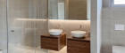 Das Schlafzimmer verfügt über ein eigenes, direkt angrenzendes Badezimmer samt Badewanne, Regendusche, Doppelwaschbecken sowie Toilette - ein Saunaanschluss ist ebenfalls vorhanden. Ein zeitloses und ansprechendes Design verleiht diesen Räumlichkeiten einen besonderen Charme.