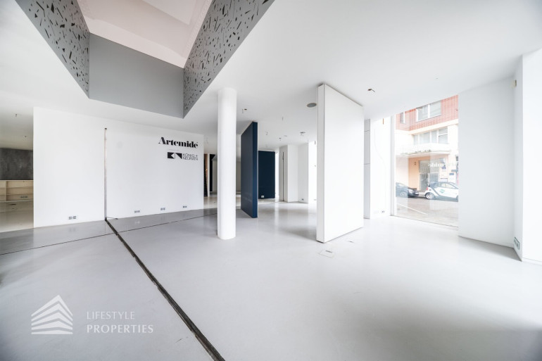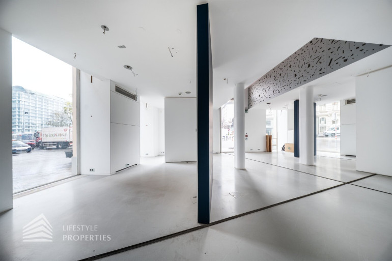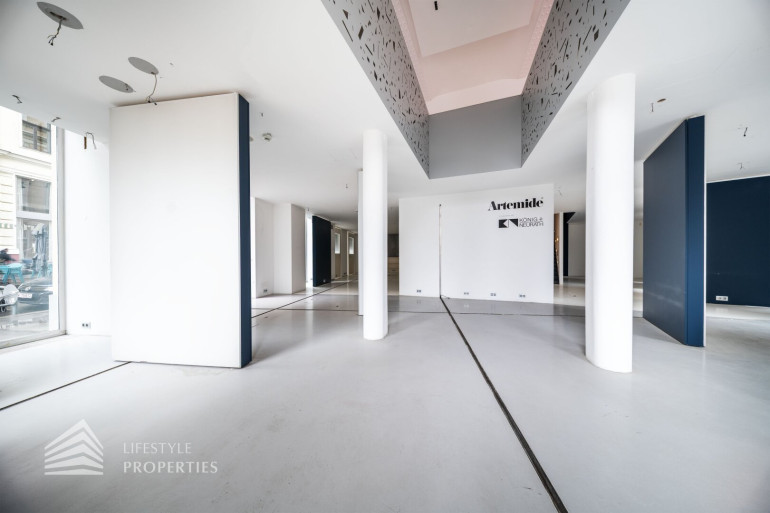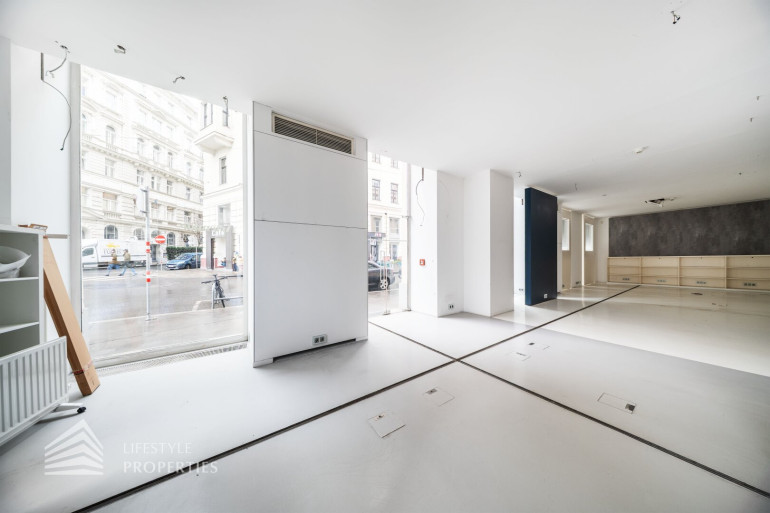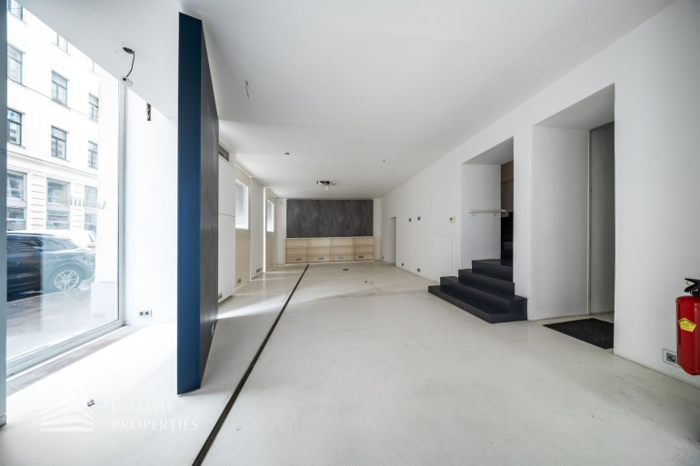 Durch die hohen Räume mit den großen Auslagenfenster ist das Geschäftslokal sehr hell und mit viel Tageslicht durchflutet.