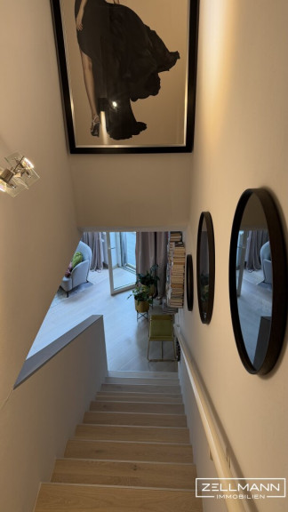 Die Wohnung erstreckt sich über zwei Ebenen und verbindet stilvolle Rückzugsräume mit einem offenen Wohnbereich samt direktem Zugang ins Freie.