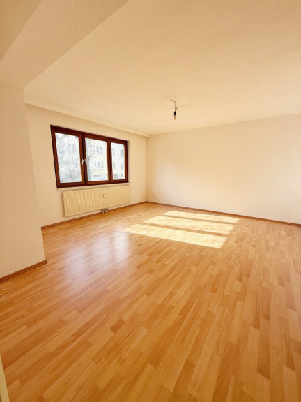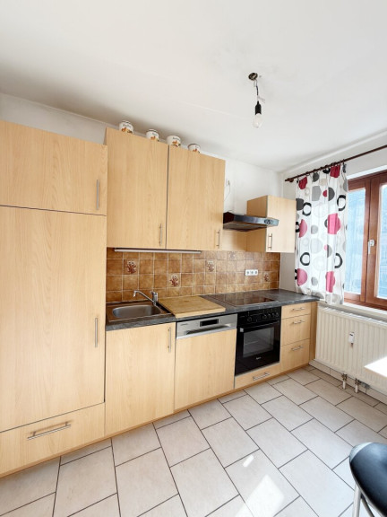 Das Wohnzimmer präsentiert sich großzügig geschnitten und bietet ausreichend Platz für Wohn- und Essbereich – ein Raum, der zu gemütlichen Stunden und entspanntem Ankommen einlädt. Von hier aus gelangt man in die separate, gut ausgestattete Küche mit Fenster, ausgestattet mit Cerankochfeld, Backofen und Kühlschrank.