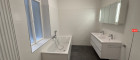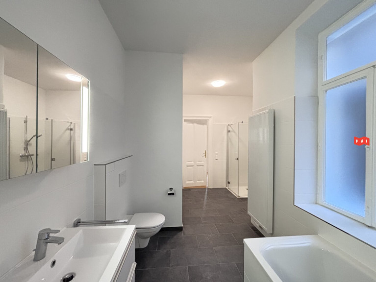 Die top moderne Küche und das Tageslichtbadezimmer mit zwei Fenster, Dusche und Badewanne fügen sich harmonisch in das stilvolle Gesamtbild ein.