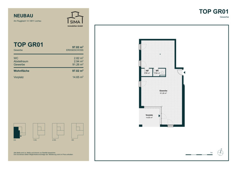 Die Einheit verfügt über eine Nutzfläche von 91,26 m² zuzüglich WC und Abstellraum, was eine Gesamtfläche von 97,02 m² ergibt. Vor der Eingangstüre steht ein großzügiger Vorplatz mit 14,65 m² zur Verfügung, der zusätzlichen Gestaltungsspielraum bietet. Zwei Freiparkplätze/Außenstellplätze können um jeweils 15.000 EURO erworben werden, ein Tiefgaragenabstellplatz kann optional um 27.000 EURO erworben werden.