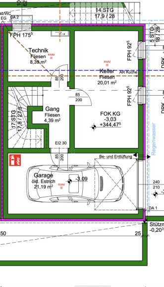 - Kellergeschoß: Garage, Technikraum, Keller