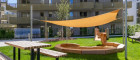 Es gibt gemeinschaftliche Freibereiche wie eine Esplanade mit einer Allee, einen zentralen Quartiersplatz, einen Kinder- und Jugendspielplatz und einen kleinen Fahrradreparaturraum. Bänke in den Freibereichen laden zum Verweilen ein.