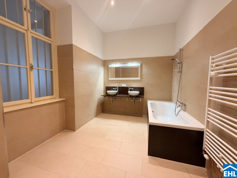 Parkett, Fliesen, Einbauküche, Wohnküche / offene Küche, Personenaufzug, Bad mit Fenster, Badewanne, Dusche