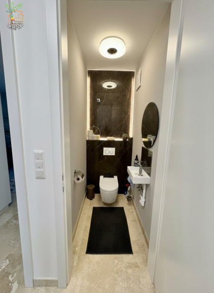 Ein praktischer Technikraum sowie ein Gäste-WC runden das Erdgeschoss ab. Nachhaltigkeit wird hier großgeschrieben: Eine moderne Luft-Wasser-Wärmepumpe sorgt für wohlige Wärme und Effizienz.