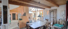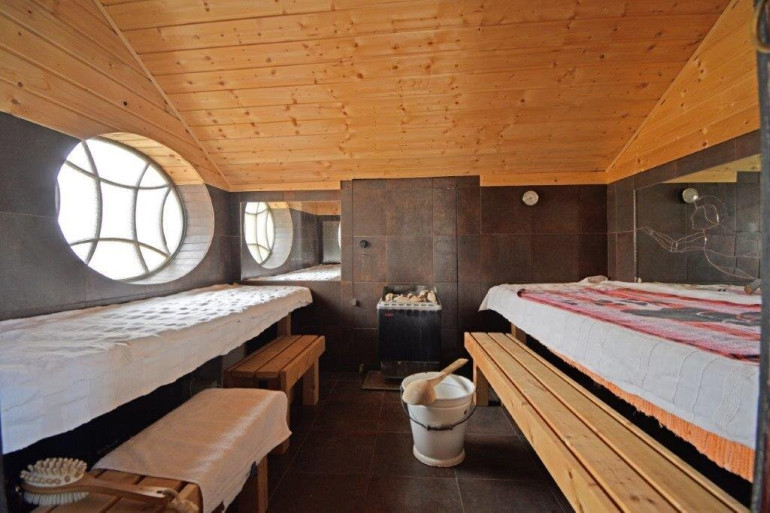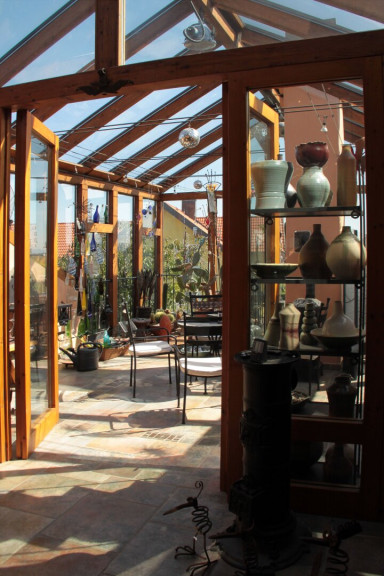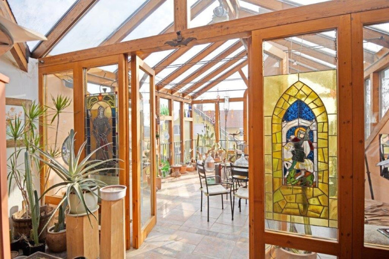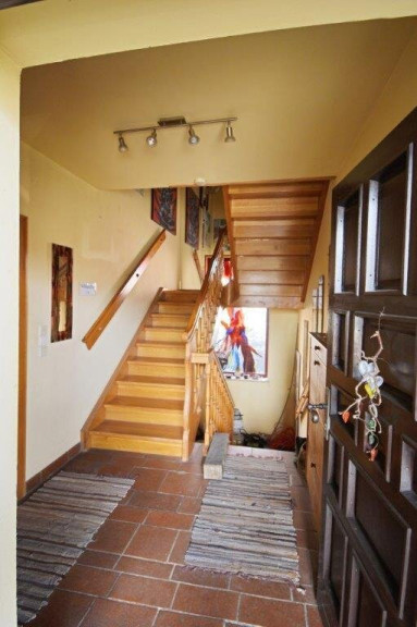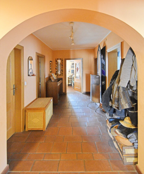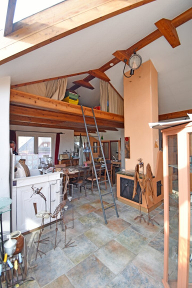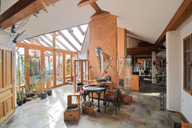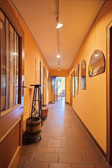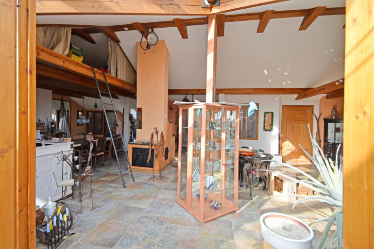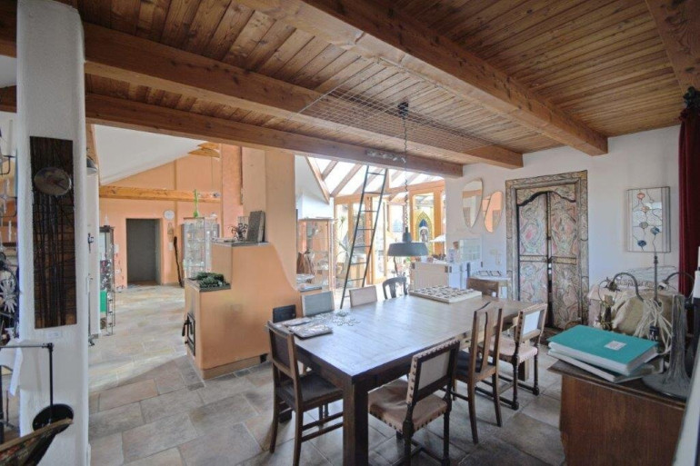 Im Großteil des Wohnbereichs ist ein hochwertiger Cottoboden verlegt. Vom Wohnraum gelangt man direkt in den 1994 erbauten, beheizbaren, 2-geschoßigen Wintergarten, der zusätzlich durch eine Wendeltreppe ins Dachgeschoss beeindruckt. Dadurch ist dieses Geschoss ein lichtdurchfluteter Raum, der zusätzlich zur Fußbodenheizung mit dem eigenen Kachelofen beheizt werden kann. Im Obergeschoss befinden sich ein Badezimmer, ein WC und eine Sauna. Über der Garage wurde zusätzlich ein Raum geschaffen.