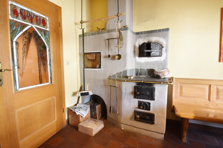 zwei Kachelöfen im Erdgeschoss. Der Kachelofen in der Küche bietet auch eine Kochmöglichkeit inkl. Backrohr