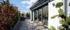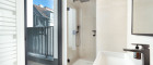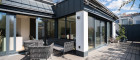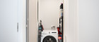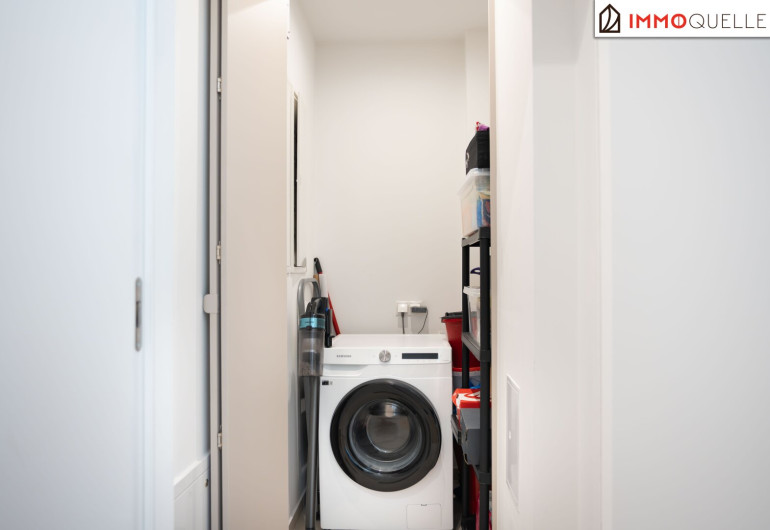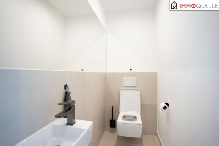 Zur Linken befinden sich ein edel ausgestattetes Gästebad mit Dusche, ein separates WC sowie ein praktischer Wasch- und Hauswirtschaftsraum - dezent integriert, hochwertig ausgeführt und mit Zugang zu einer eigenen Terrasse.