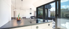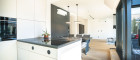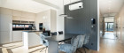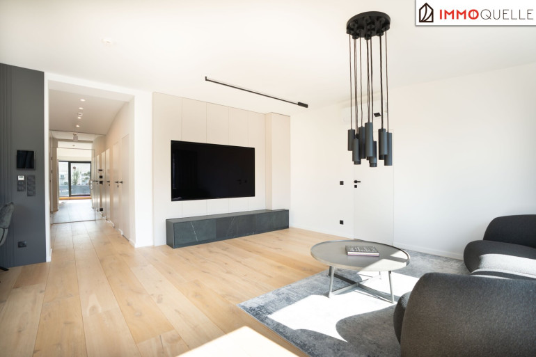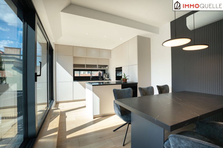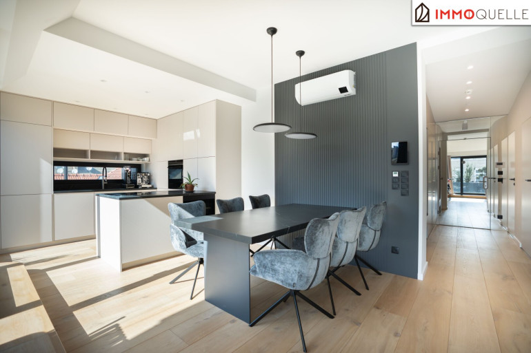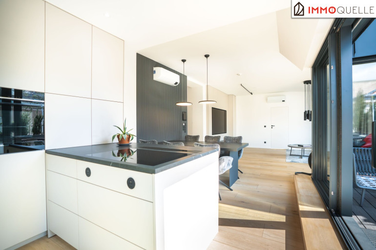 Der zentrale Wohnbereich beeindruckt durch seine offene Gestaltung und seine Großzügigkeit: 45 m² fließender Raum verbinden Küche, Essplatz und Lounge zu einem stilvollen Mittelpunkt des täglichen Lebens. Die hochwertige Küche mit Kochinsel und Geräten der Siemens fügt sich perfekt in das Designkonzept - dezent, aber luxuriös. Rundum sorgen elektrisch steuerbare Sonnenschutzsysteme, Vollklimatisierung und ein smartes Lichtsystem für maximalen Komfort - gesteuert über das integrierte Smart-Home-System.