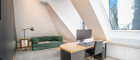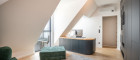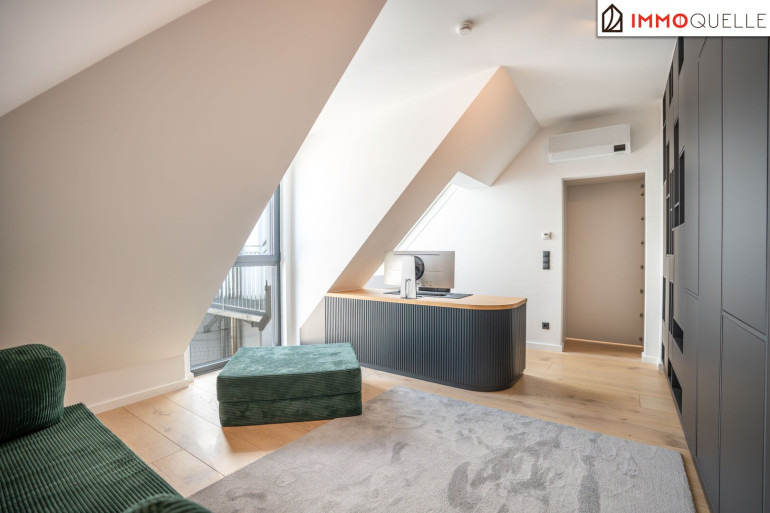 Zur Rechten öffnet sich ein zusätzlicher Raum, der vielfältige Nutzungsmöglichkeiten bietet - ob als elegantes Büro, charmantes Gästezimmer oder persönlicher Rückzugsort. Mit seiner ruhigen Lage, maßgefertigter Ausstattung und klaren Linien fügt er sich harmonisch in das großzügige Gesamtbild dieser Residenz ein.