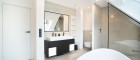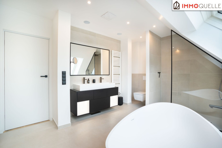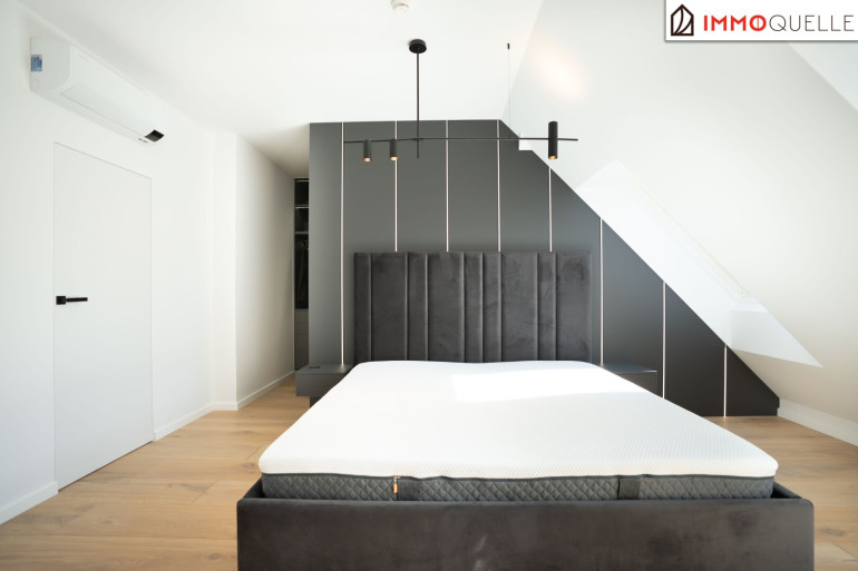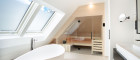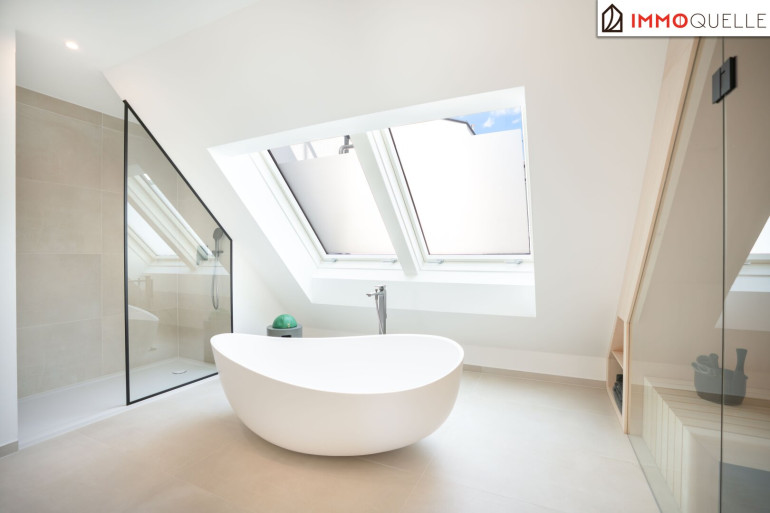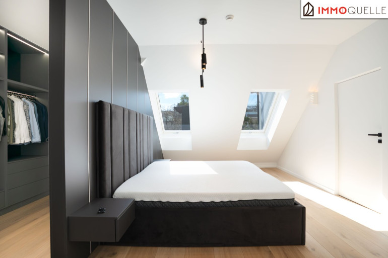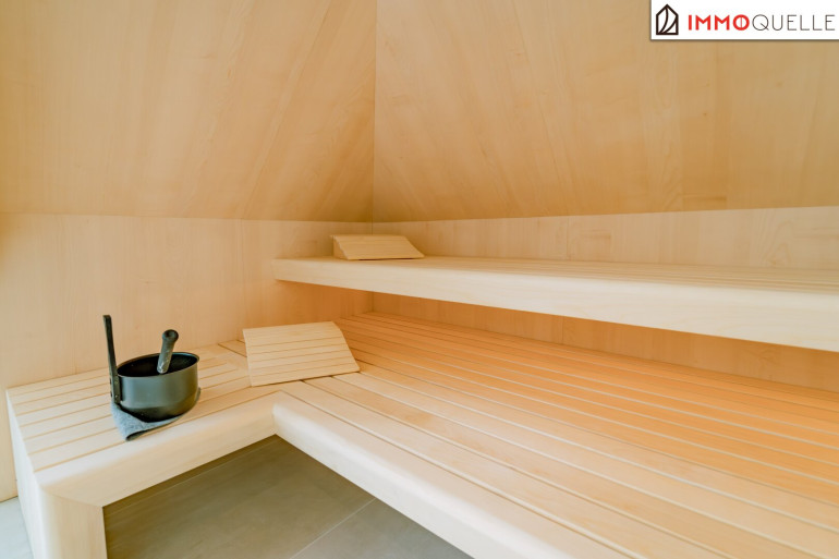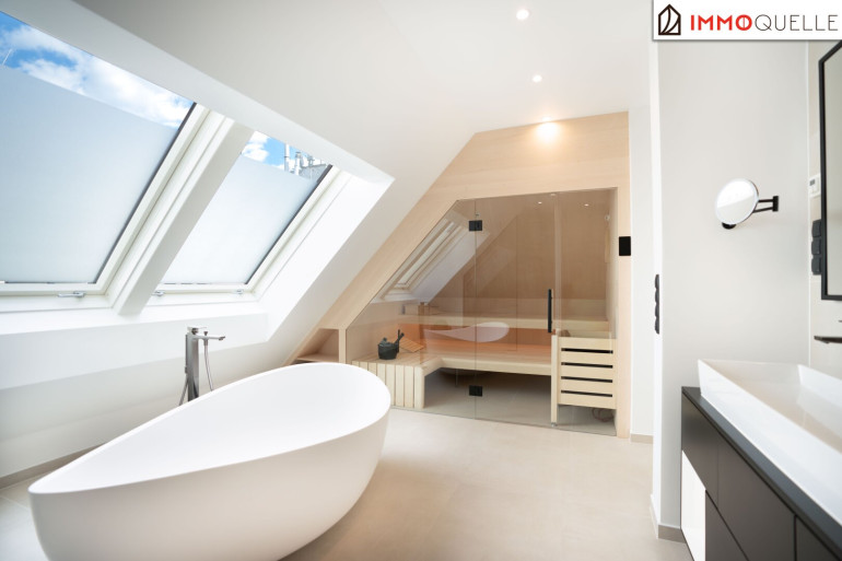 Der Masterbereich wurde als privater Rückzugsort mit Spa-Charakter konzipiert - ausgestattet mit einem eigenen Schrankraum und einem Wellnessbad auf höchstem Niveau. Eine freistehende Badewanne, eine großzügige Walk-in-Dusche und als zentrales Highlight eine Design-Sauna mit kombinierbarem Finn- und Kräuterofen schaffen eine Atmosphäre der Erholung. Indirektes Lichtspektakel und Touchscreen-Steuerung verwandeln diesen Bereich in eine Oase der Ruhe - fern vom Alltag, mitten im Zuhause