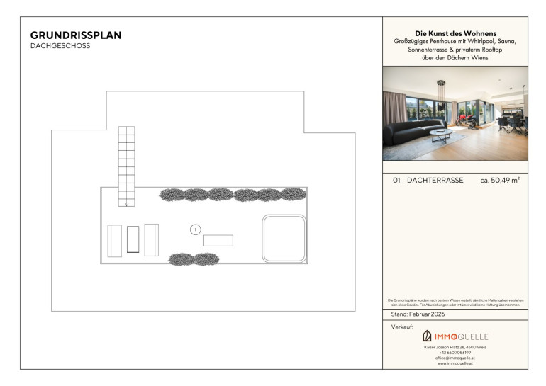 Die private Dachterrasse ist die Krönung dieses Penthouses. Über eine Treppe erreichen Sie die zweite Ebene - ein exklusiver Rückzugsort unter freiem Himmel, geschaffen zum Verweilen, Genießen und Repräsentieren. Hier oben eröffnet sich ein nahezu 360°-Panorama über die Dächer Wiens. Auf rund 50 m² entfaltet sich ein Freiluftrefugium mit urbanem Luxus: Ein hochwertiger Whirlpool für bis zu fünf Personen, die Option für eine integrierte Outdoor-Küche und elegante Begrünung schaffen eine einzigartige Wohlfühlkulisse - ruhig, privat, über der Stadt.