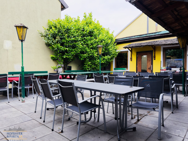 Im Außenbereich bietet der Schanigarten mit Platz für etwa 50 Gäste ein großes Potenzial für saisonale Bewirtung und Veranstaltungen unter freiem Himmel. Die Fläche eignet sich ideal für einen klassischen Gastgarten, aber auch für moderne Konzepte wie Streetfood, Pop-ups oder kleinere Events.