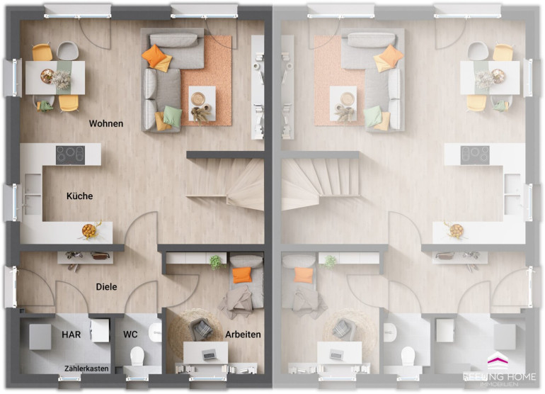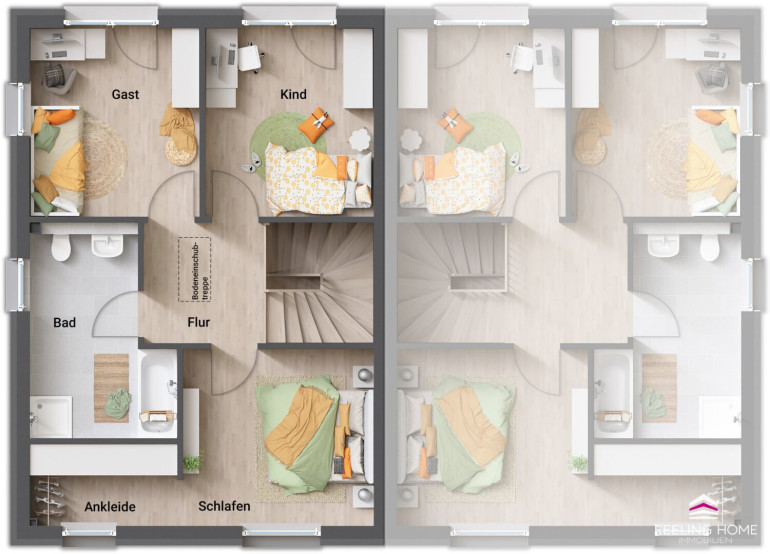 Bis auf die Grundstücksfotos, darf ich freundlichst verweisen, dass die Renderings ein mögliches Wohnambiente simulieren und das Doppelhaus mit Hilfe von KI in das Grundstück implementiert wurde.